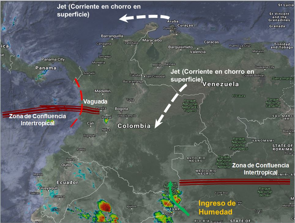 Condiciones inestables en algunos sectores debido a la interacción de la Zona de Confluencia intertropical con una Vaguada al occidente del país y el ingreso de humedad por el sur oriente incrementando la nubosidad en la región Amazónica. Condiciones de tiempo seco en la región Caribe y Orinoquia debido a corrientes en chorro en superficie.