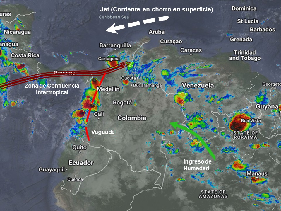 El ramal Pacífico de la Zona de Confluencia Intertropical en interacción con una Vaguada, un Sistema de Baja Presión, una Onda Tropical del Este, el ingreso de humedad por el Suroriente y Occidente del país, así como procesos convectivos locales favorecen condiciones inestables que generan lluvias ligeras a fuertes y algunas tormentas en sectores de los departamentos de Córdoba, Antioquia, Chocó, Valle del Cauca, Cauca, Nariño, Eje Cafetero, Cundinamarca, Casanare, Arauca, Vichada, Meta, Caquetá, Putumayo, Guaviare, Guainía, Vaupés y Amazonas. Precipitaciones ocasionales y lluvias de menor intensidad en sectores de los departamentos de La Guajira, Cesar, Atlántico, Bolívar, Sucre, Los Santanderes, Boyacá, Tolima y Huila.