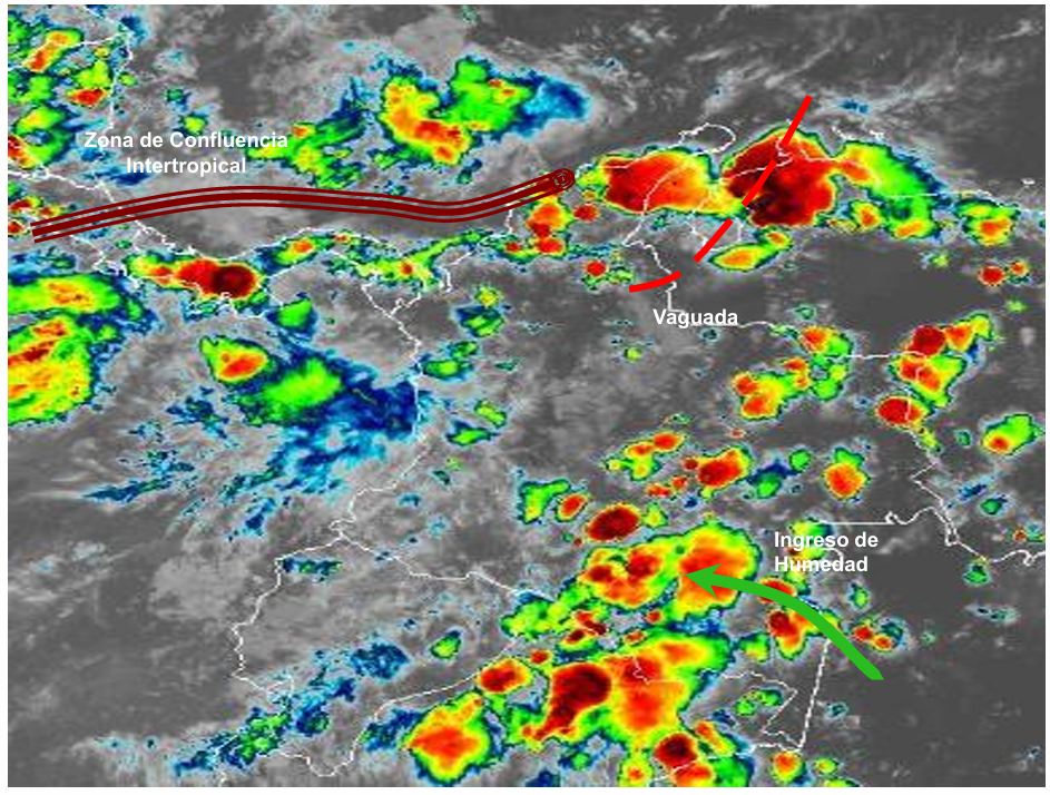 El ramal Pacífico de la Zona de Confluencia Intertropical en interacción con una Vaguada, el ingreso de humedad por el Oriente del país, así como procesos convectivos locales, favorecen condiciones inestables que generan lluvias sectorizadas a fuertes y algunas tormentas en sectores de los departamentos de La Guajira, Atlántico, Magdalena, Cesar, Sucre, Bolívar, Los Santanderes, Córdoba, Antioquia, Eje Cafetero, Chocó, Valle del Cauca, Nariño, Boyacá, Cundinamarca, Vichada, Guainía y Amazonas. Precipitaciones ocasionales y lluvias de menor intensidad en los departamentos de Tolima, Huila, Caquetá, Meta, Guaviare y Vaupés.