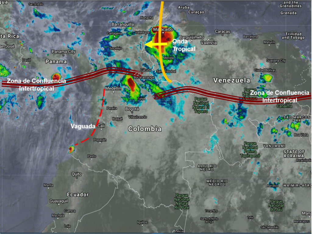 El ramal pacifico de la Zona de Confluencia Intertropical en interacción con una vaguada y el paso de una Onda Tropical del Este, generan nubosidad convectiva y lluvias de variada intensidad afectando principalmente sectores de los departamentos de La Guajira, Cesar, Magdalena, Bolívar, Córdoba, Antioquia, Santanderes, Chocó, Valle del Cauca, Cauca, Guainía y Vichada. Precipitaciones ocasionales y lluvias de menor intensidad en Arauca, Casanare, Boyacá, Cundinamarca, Eje Cafetero, Tolima, Huila y Nariño.