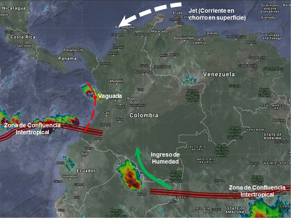 La interacción de la Zona de Confluencia Intertropical con una Vaguada en el pacifico, favorece condiciones inestables en los departamentos del occidente del país. El ingreso de humedad por el suroriente del país, genera lluvias ligeras a moderadas en la Amazonia Colombiana y vientos fuertes en el caribe debido a una corriente en chorro en superficie.