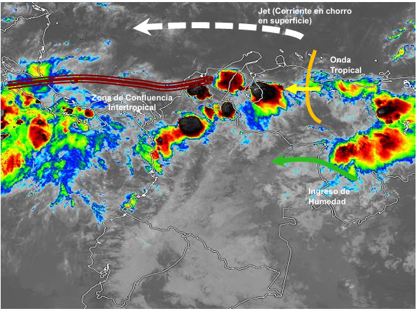 El ramal Pacífico de la Zona de Confluencia Intertropical en interacción con una Vaguada, un Sistema de Baja Presión, el ingreso de humedad por el Oriente del país por el paso de una Onda Tropical del Este, así como procesos convectivos locales favorecen condiciones inestables, que generan lluvias ligeras a fuertes y algunas tormentas en sectores de los departamentos de Guajira, Cesar, Magdalena, Bolívar, Atlántico, Sucre, Córdoba, Antioquia, Santanderes, Boyacá, Cundinamarca, Eje Cafetero, Chocó, Valle del Cauca, Cauca, Nariño, Vichada, Guainía y Vaupés. Precipitaciones ocasionales y lluvias de menor intensidad en los departamentos de Huila, Tolima, Putumayo, Caquetá, Casanare y Meta.