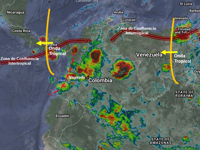 La interacción del ramal Pacifico de la Zona de Confluencia Intertropical con una Vaguada y el paso de una Onda Tropical del Este, generan condiciones inestables en gran parte del territorio nacional. Se prevén lluvias fuertes y tormentas en sectores de los departamentos de Norte de Santander, Santander, Boyacá, Cundinamarca, Chocó, Valle del Cauca, Cauca, Nariño, Caquetá, Putumayo y Amazonas. Precipitaciones ocasionales y lluvias de menor intensidad en Atlántico, Magdalena, Cesar, Eje Cafetero, Tolima, Huila, Vaupés, Guaviare, Meta, Arauca, Casanare Vichada y Guainía.