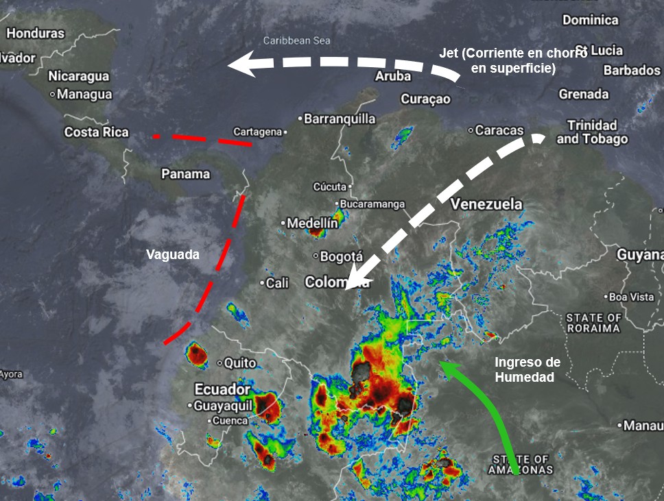 El ramal Pacífico de la Zona de Confluencia Intertropical, en interacción con dos Vaguadas, un Sistema de Baja Presión, el ingreso de humedad desde el suroriente del país y procesos convectivos locales favorecen condiciones inestables, que generan lluvias ligeras a moderadas y algunas tormentas en sectores de los departamentos de Amazonas, Antioquia, Atlántico, Bolívar, Boyacá, Caldas, Caquetá, Cauca, Cesar, Chocó, Córdoba, Cundinamarca, Guainía, Guaviare, Huila, Magdalena, Nariño, Putumayo, Quindío, Risaralda, Santander, Sucre, Tolima, Valle del Cauca, Vaupés y Vichada. Precipitaciones ocasionales y lluvias de menor intensidad en los departamentos de Arauca, Casanare, Meta, La Guajira y Norte de Santander.