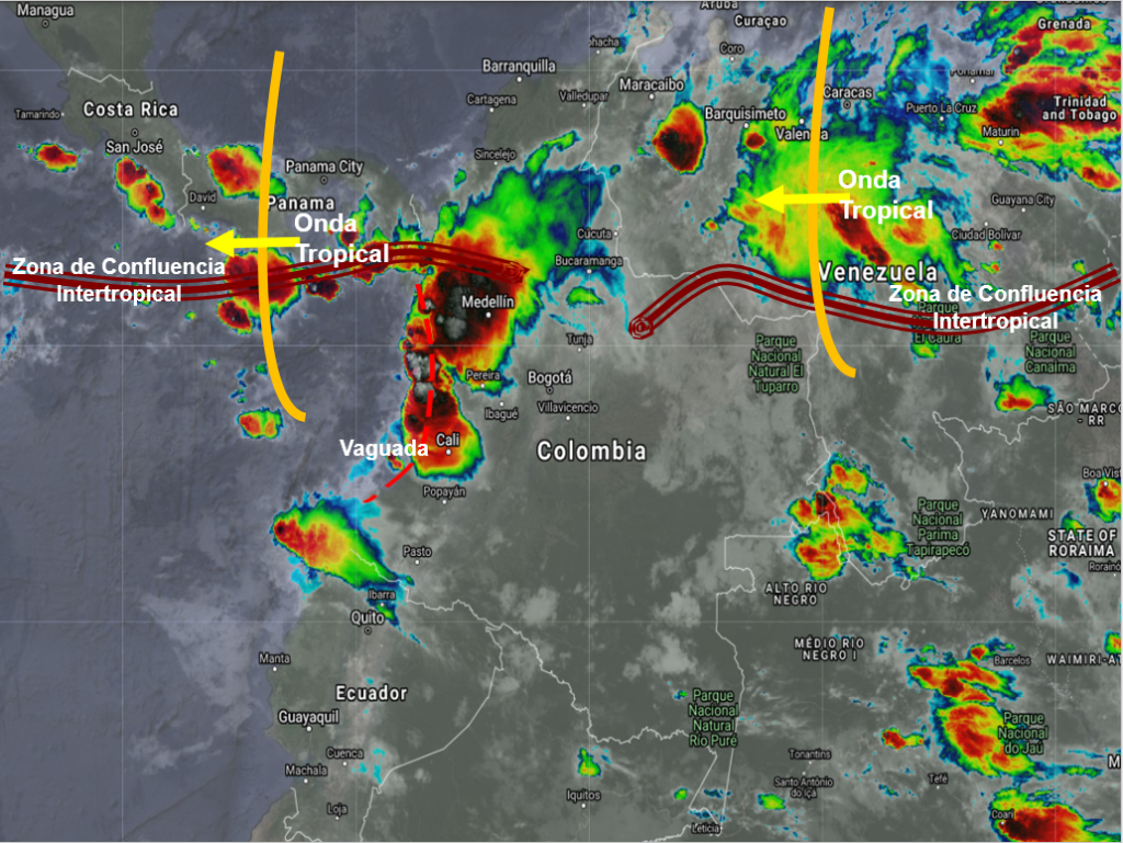 El ramal pacifico de la Zona de Confluencia Intertropical en interacción con una vaguada y un sistema de baja presión, así como el ingreso de humedad por el oriente, procesos convectivos locales y el paso de Ondas tropicales del Este, generan condiciones inestables en gran parte del territorio nacional, produciendo lluvias de variada intensidad en sectores de los departamentos de Nariño, Cauca, Valle, Chocó, Córdoba, Sucre, Bolívar, Cesar, Magdalena, Atlántico, Cesar, Antioquia, Santander, Cundinamarca, Boyacá, Eje Cafetero, Vichada, Casanare, Arauca, Meta, Amazonas, Vaupés, Caquetá, Putumayo y Guaviare.