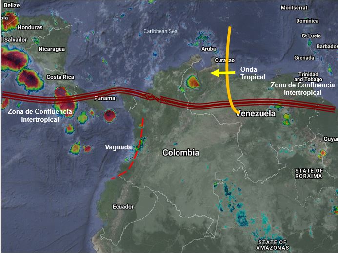 El ramal pacifico de la Zona de Confluencia Intertropical en interacción con una vaguada y el paso de una Onda Tropical del Este, generan condiciones inestables en sectores de la región Pacifica y en la Orinoquia. Lluvias moderadas y algunas tormentas en Vichada, Arauca, Casanare, Meta, Piedemonte Llanero, Cauca, Valle del Cauca, Chocó, Antioquia, Córdoba y el sur de Bolívar. Precipitaciones de menor intensidad en Vaupés, Guaviare, Caquetá y Amazonas.