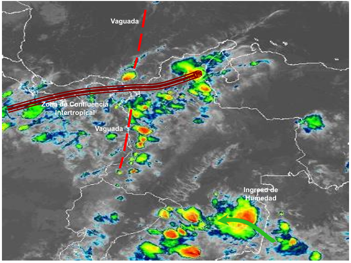 El ramal Pacífico de la Zona de Confluencia Intertropical en interacción con una Vaguada, un Sistema de Baja Presión, así como procesos convectivos locales favorecen condiciones inestables, que generan lluvias ligeras a moderadas y algunas tormentas en sectores de los departamentos de Antioquia, Amazonas, Atlántico, Bolívar, Boyacá, Eje Cafetero, Cauca, Cesar, Chocó, Córdoba, Cundinamarca, Guainía, Guaviare, Huila, La Guajira, Magdalena, Meta, Nariño, Santanderes, Putumayo, Caquetá, Casanare, Santanderes, Sucre, Tolima, Valle del Cauca, Arauca, Vaupés y Vichada.