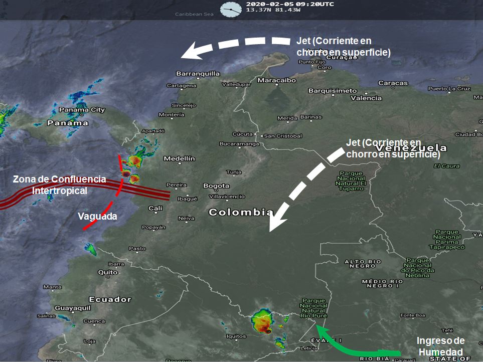 Condiciones de tiempo seco en gran parte del territorio nacional, la interacción de la Zona de Confluencia intertropical con una Vaguada al occidente del país podría generar algunas precipitaciones ocasionales en sectores de los departamentos de Antioquia, Chocó, Valle del Cauca, Cauca, Nariño, Eje Cafetero, Cundinamarca, Boyacá y Santander. El Ingreso de humedad por el sur del país genera lluvias ligeras en Amazonas. Vientos fuertes en la región Caribe y Orinoquia debido a corrientes en chorro en superficie con intensidades entre 25 y 30 nudos (50 a 60 km/h).
