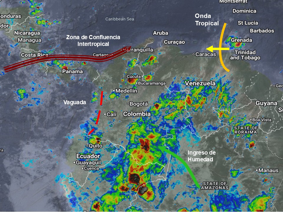 El ramal Pacífico de la Zona de Confluencia Intertropical en interacción con una Vaguada, así como procesos convectivos locales favorecen condiciones inestables, que generan lluvias ligeras a moderadas y algunas tormentas en sectores de los departamentos de la Guajira, Atlántico, Magdalena, Cesar, Córdoba, Sucre, Bolívar, Los Santanderes, Antioquia, Chocó, Valle del Cauca, Cauca, Nariño, Putumayo, Huila, Cundinamarca, Boyacá, Arauca, Meta, Vichada, Guaviare, Guainía, Vaupés y Amazonas. Precipitaciones ocasionales y lluvias de menor intensidad en los departamentos de Tolima y Casanare.