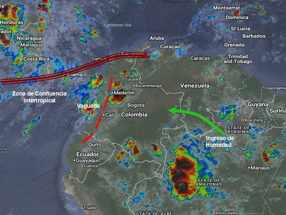 El ramal Pacífico de la Zona de Confluencia Intertropical en interacción con una Vaguada, el ingreso de humedad por el Oriente del país, así como procesos convectivos locales favorecen condiciones inestables, que generan lluvias ligeras a moderadas y algunas tormentas en sectores de los departamentos de Guajira, Cesar, Magdalena, Atlántico, Córdoba, Sucre, Bolívar, Los Santanderes, Antioquia, Chocó, Valle del Cauca, Cauca, Nariño, Eje Cafetero, Arauca, Casanare, Meta, Caquetá, Putumayo, Vichada, Guaviare, Vaupés y Amazonas. Precipitaciones ocasionales y lluvias de menor intensidad en los departamentos de Boyacá, Cundinamarca, Tolima, Huila y Guainía.