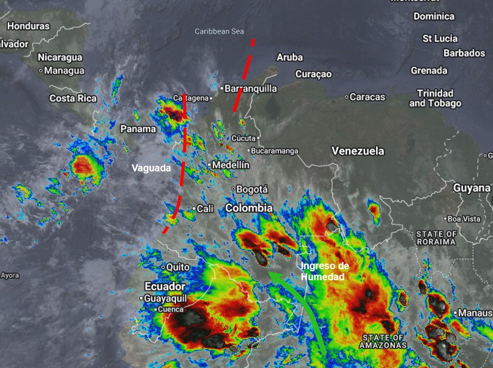 El ramal Pacífico de la Zona de Confluencia Intertropical en interacción con una Vaguada, un Sistema de Baja Presión, así como procesos convectivos locales favorecen condiciones inestables, que generan lluvias de ligeras a fuertes y algunas tormentas en sectores de los departamentos de Choco, Valle del Cauca, Cauca, Nariño, Antioquia, Bolivar, Cesar, Sucre, Norte de Santander, Santander, Tolima, Boyacá, Eje Cafetero y Guainía. Precipitaciones ocasionales y lluvias de menor intensidad en los departamentos de Amazonas, Arauca, Atlántico, Caquetá, Casanare, Córdoba, Cundinamarca, Guaviare, Huila, Putumayo, La Guajira, Magdalena, Meta, Vaupés y Vichada.