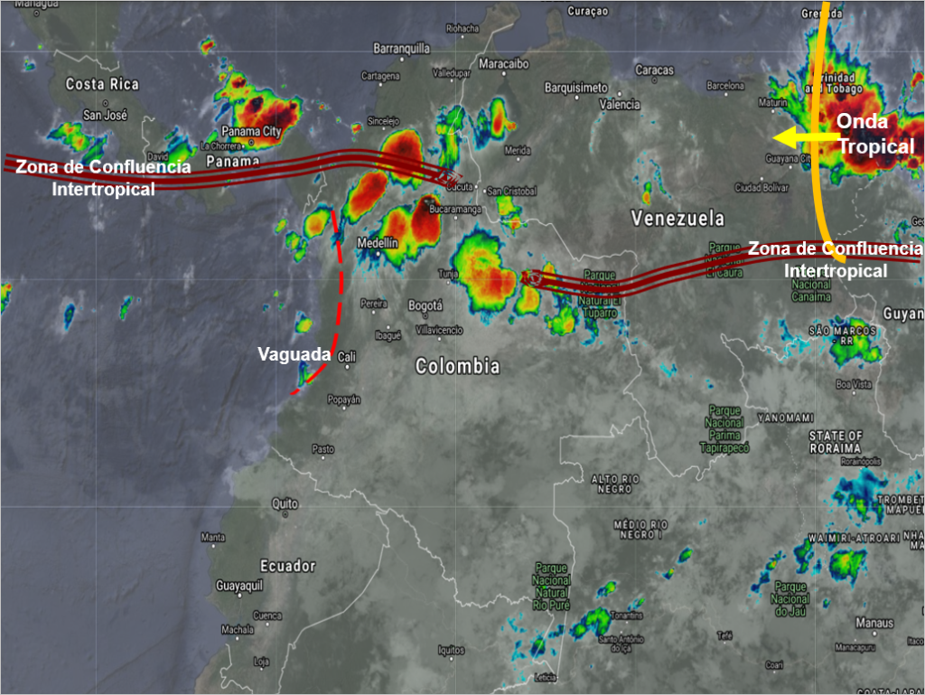 El ramal pacifico de la Zona de Confluencia Intertropical en interacción con una vaguada genera lluvias ligeras en las regiones Pacífica, Andina y Caribe, especialmente en horas de la tarde y noche, afectando sectores de los departamentos de Cesar, Magdalena, Bolívar, Córdoba, chocó, Antioquia, Eje Cafetero, Valle del Cauca, Cauca, Nariño, Los Santanderes, Boyacá, Cundinamarca, Vichada, Meta, Casanare y Arauca.