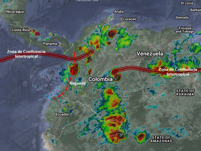 La interacción del ramal Pacífico de la Zona de Confluencia Intertropical con una Vaguada, el ingreso de humedad desde el oriente y procesos convectivos locales favorecen condiciones inestables en gran parte del país, probabilidad de lluvias moderadas a fuertes, algunas acompañadas de actividad eléctrica, en sectores de los departamentos de Córdoba, Sucre, Bolívar, Magdalena, Cesar, Guajira, Norte de Santander, Santander, Boyacá, Cundinamarca, Antioquia, Eje Cafetero, Chocó, Valle del Cauca, Cauca, Nariño, Huila, Tolima, Meta, Caquetá, Putumayo, Vaupés, Guaviare, Guainía, Vichada y Casanare, precipitaciones ocasionales y lluvias de menor intensidad en Arauca y Amazonas.