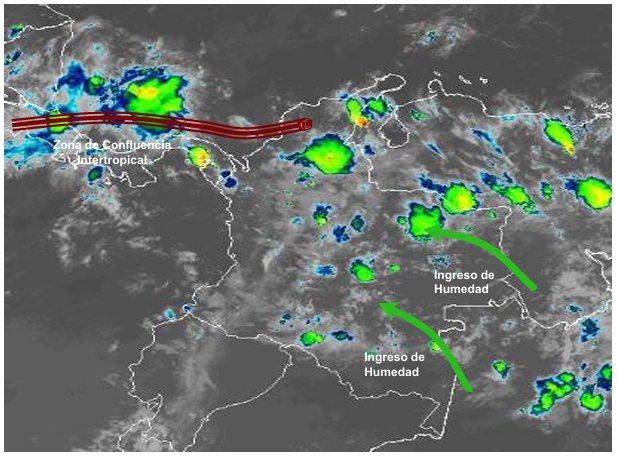 El ramal Pacífico de la Zona de Confluencia Intertropical en interacción con una Vaguada, el ingreso de humedad por el Oriente y Suroriente del país, así como como procesos convectivos locales favorecen condiciones inestables, que generan lluvias ligeras a moderadas y algunas tormentas en sectores de los departamentos de Córdoba, Bolívar, Sucre, Antioquia, Santanderes, Boyacá, Casanare, Vichada, Guainía, Vaupés. Precipitaciones ocasionales y lluvias de menor intensidad en los departamentos de Cesar, Chocó, Cundinamarca, Eje Cafetero, Valle del Cauca, Cauca, Meta y Guaviare.