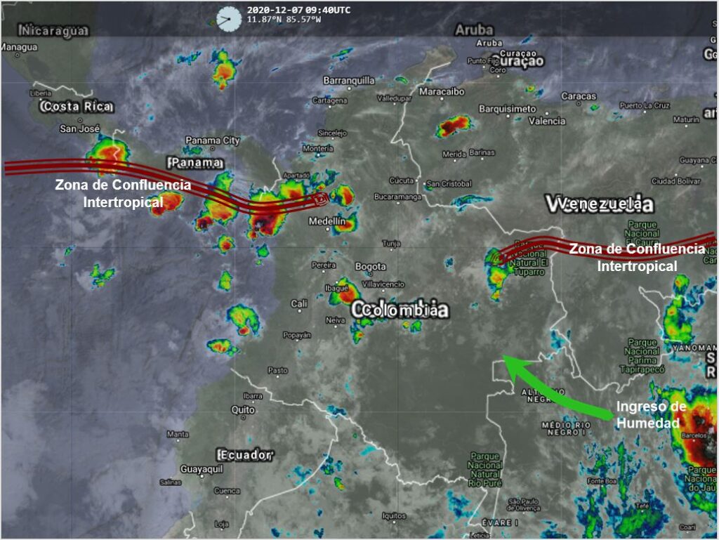 La Zona de Confluencia Intertropical genera lluvias moderadas en sectores de Córdoba, Chocó, Antioquia, Valle, Cauca, Nariño, Santander, Cundinamarca, Boyacá y Eje Cafetero especialmente en horas de la tarde. El ingreso de humedad por el suroriente del país favorece la presencia de lluvias ligeras en sectores de los departamentos de Amazonas, Guaviare, Vaupés, Guainía, Caquetá, Putumayo y Meta durante toda la jornada.