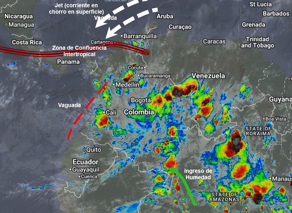 El ramal Pacífico de la Zona de Confluencia Intertropical en interacción con una Vaguada, un Sistema de Baja Presión, así como procesos convectivos locales favorecen condiciones inestables, que generan lluvias ligeras a moderadas y algunas tormentas en sectores de los departamentos de Antioquia, Amazonas, Boyacá, Eje Cafetero, Cauca, Cesar, Chocó, Córdoba, Cundinamarca, Guaviare, Huila, Meta, Nariño, Santanderes, Putumayo, Caquetá, Casanare, Santanderes, Tolima, Valle del Cauca, Arauca, Vaupés y Vichada. Precipitaciones ocasionales y lluvias de menor intensidad en los departamentos de Arauca, Guajira, Guainía, Córdoba, Sucre, Magdalena, Atlántico y Bolívar
