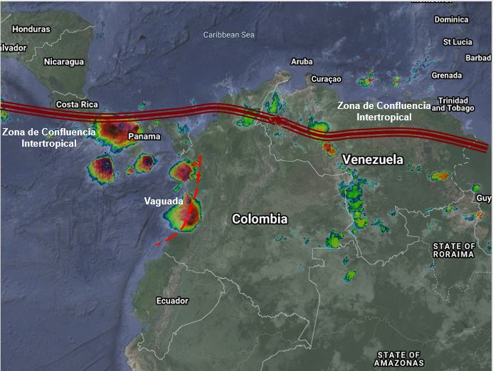 El ramal pacifico de la Zona de Confluencia Intertropical en interacción con una vaguada genera lluvias ligeras a moderadas, algunas acompañadas de actividad eléctrica en las regiones Pacífica, Andina y Caribe, especialmente en horas de la tarde y noche, afectando sectores de los departamentos de Magdalena, Bolívar, Córdoba, Sucre, Chocó, Antioquia, Eje Cafetero, Valle del Cauca y Cauca. Precipitaciones de menor intensidad en Santander, Boyacá, Arauca, Casanare, Meta, Vichada, Guainía, Vaupés, Guaviare, Caquetá y Amazonas.