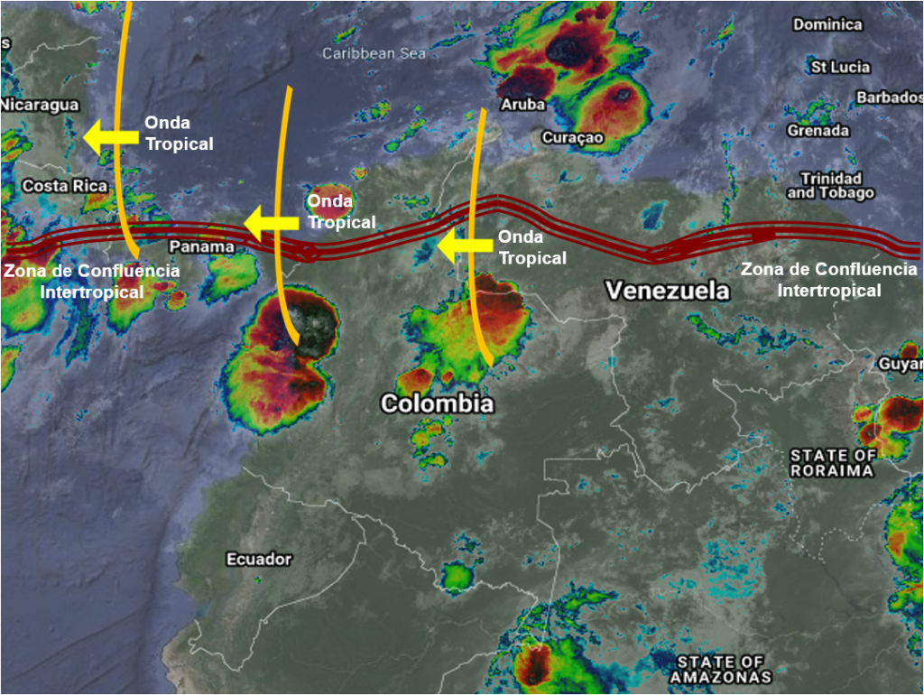 El paso continuo de Ondas Tropicales del Este genera condiciones inestables en gran parte del territorio nacional. Lluvias de variada intensidad y algunas tormentas en el Eje Cafetero, Antioquia, Chocó, Córdoba, Sucre, Bolívar, Atlántico, Magdalena, La Guajira, Cesar, Norte de Santander, Santander, Boyacá, Arauca, Casanare, Meta, Vichada, Guainía, Guaviare, Vaupés, Caquetá y Amazonas.