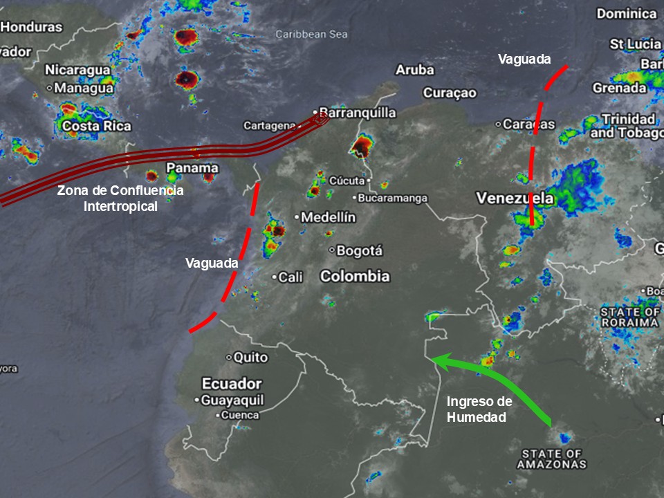 El ramal Pacífico de la Zona de Confluencia Intertropical en interacción con una Vaguada, el ingreso de humedad por el Oriente del país, así como procesos convectivos locales, favorecen condiciones inestables que generan lluvias sectorizadas a fuertes y algunas tormentas en sectores de los departamentos de la Guajira, Atlántico, Magdalena, Cesar, Antioquia, Chocó, Valle del Cauca, Cauca, Nariño, Santander, Boyacá, Cundinamarca, Putumayo, Caquetá, Meta, Casanare, Arauca, Vichada, Guainía, Vaupés y Amazonas. Precipitaciones ocasionales y lluvias de menor intensidad en los departamentos de Bolívar, Sucre, Córdoba, Norte de Santander, Tolima y Huila.