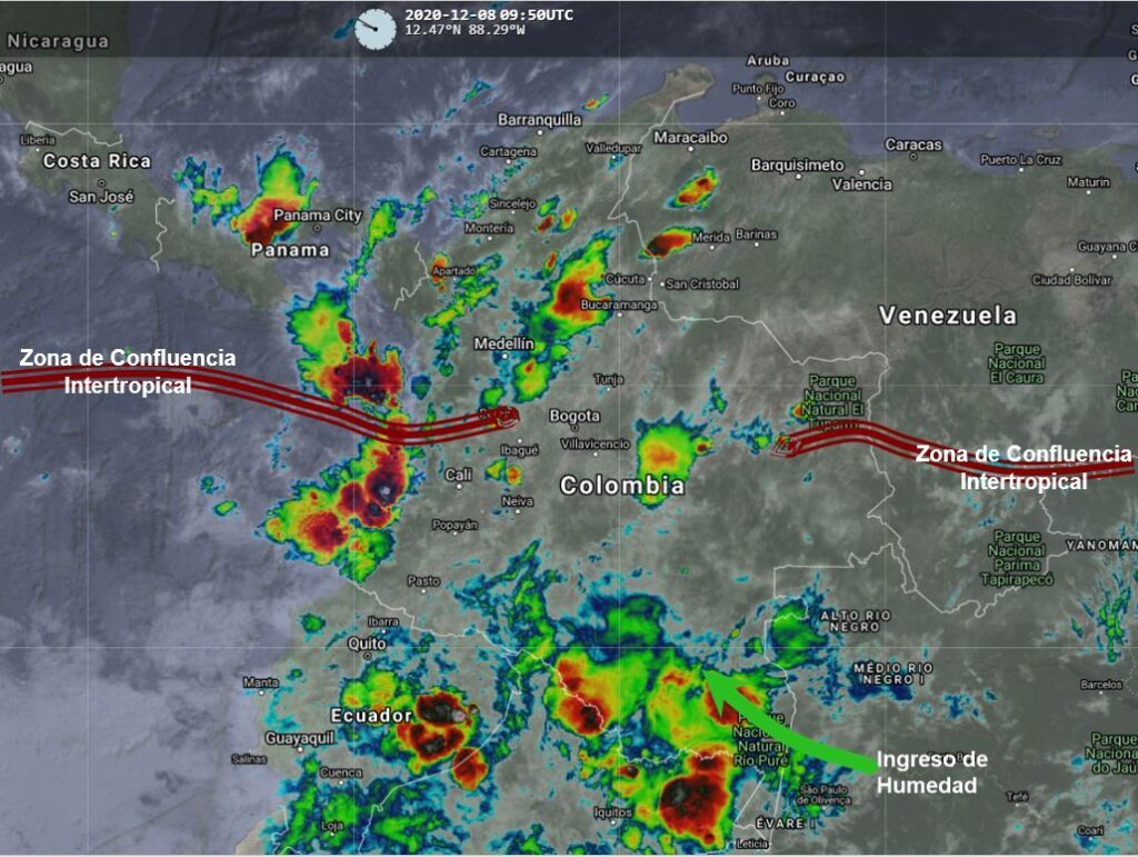 La Zona de Confluencia Intertropical y el ingreso de humedad por el suroriente del país, generan lluvias moderadas en sectores de Chocó, Antioquia, Valle, Cauca, Tolima, Eje Cafetero, Nariño, Amazonas, Vaupés, Guaviare, Caquetá, Putumayo y Vichada especialmente en horas de la tarde. Precipitaciones ocasionales y lluvias de menor intensidad en Santander, Cundinamarca, Boyacá, Huila, Casanare y Meta.