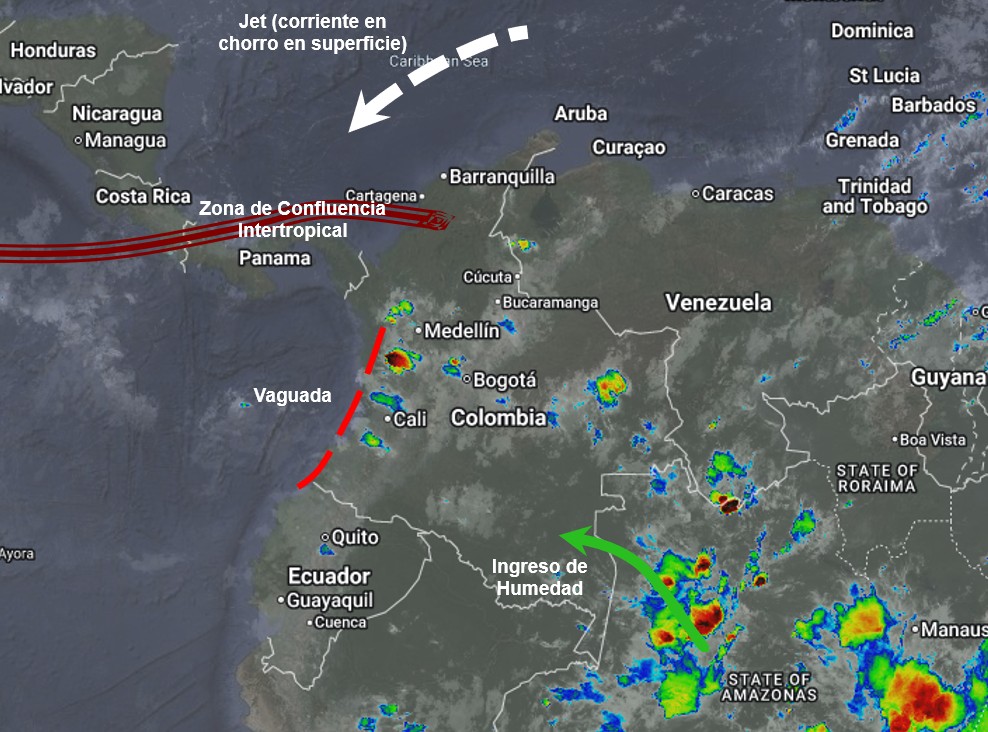 El ramal Pacífico de la Zona de Confluencia Intertropical en interacción con una Vaguada, un Sistema de Baja Presión, así como procesos convectivos locales favorecen condiciones inestables, que generan lluvias ligeras a moderadas y algunas tormentas en sectores de los departamentos de Antioquia, Boyacá, Cundinamarca, Tolima, Huila, Nariño, Cauca, Valle del Cauca, Choco, Guainía, Guaviare, Vaupés, Caquetá, Amazonas y Santander. Precipitaciones ocasionales y lluvias de menor intensidad en los departamentos de Atlántico, Bolívar, Caldas, Casanare, Cesar, Córdoba, La Guajira, Magdalena, Meta, Norte de Santander, Putumayo, Quindío, Risaralda, Sucre, Arauca y Vichada.