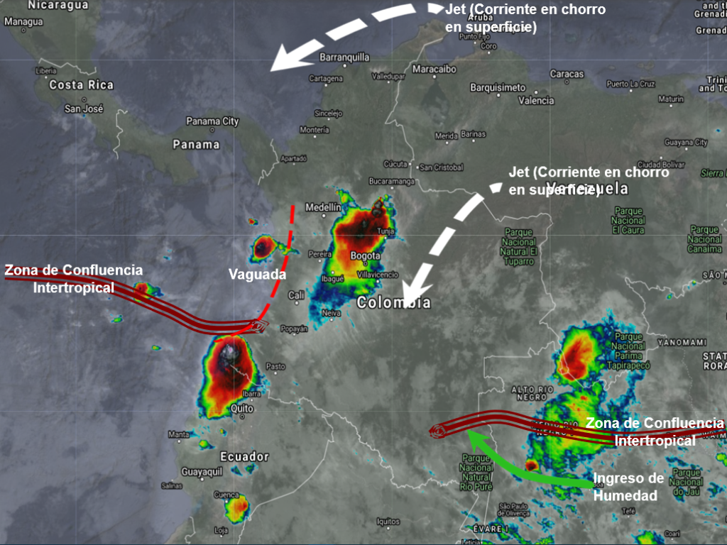El ramal pacifico de la Zona de Confluencia Intertropical (ZCIT) en interacción con una Vaguada en el Pacífico, favorece condiciones inestables aumentando la nubosidad y generando lluvias de variada intensidad especialmente en horas de la tarde en Nariño, Cauca, Valle y Chocó. El ingreso de humedad por el suroriente del territorio nacional favorece la presencia de lluvias ligeras en Amazonas, Vaupés y Guainía. Procesos convectivos locales generan lluvias ligeras a moderadas y algunas tormentas aisladas en Santander, Boyacá, Cundinamarca, Antioquia, Eje Cafetero, Tolima y Huila. Se encuentran activas corrientes en chorro en superficie en el mar Caribe y la Orinoquia, con vientos entre 20 y 30 nudos (37 a 55 km/h), que favorece condiciones de tiempo seco en la costa norte y llanos orientales.