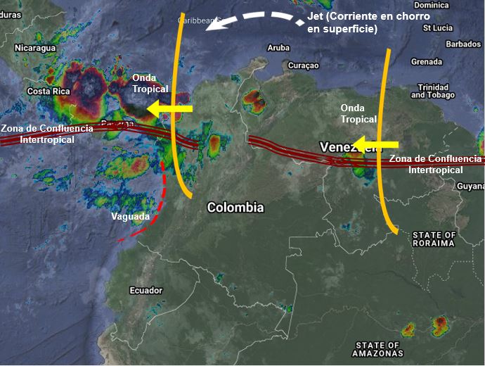 El paso continuo de Ondas Tropicales del Este y la interacción de la Zona de Confluencia Intertropical con una vaguada, generan inestabilidad atmosférica en algunos sectores de la región Caribe y Pacífica. Para hoy se prevén lluvias ligeras a moderadas en los departamentos de Magdalena, Córdoba, Antioquia, Eje Cafetero, Chocó, Valle del Cauca, Cauca, Caquetá, Amazonas, Vaupés, Guaviare, Guainía y Vichada. Precipitaciones ocasionales y lluvias sectorizadas en La Guajira, Cesar, Atlántico, Bolívar, Sucre, Santanderes, Boyacá, Cundinamarca, Tolima, Huila, Nariño, Putumayo, Meta, Casanare y Arauca