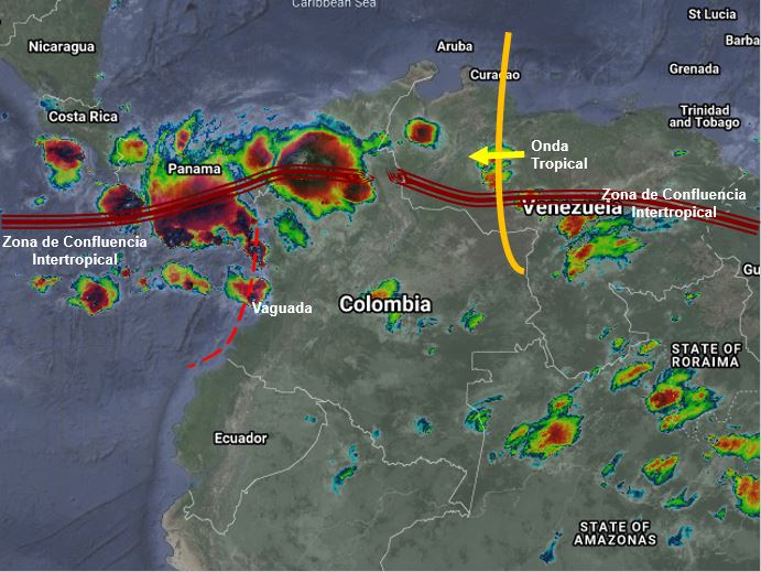 El ramal pacifico de la Zona de Confluencia Intertropical en interacción con una vaguada, el paso de Ondas tropicales del Este, un sistema de baja presión y sistemas convectivos locales generan lluvias ligeras a moderadas, algunas acompañadas de actividad eléctrica en gran parte del país, afectando sectores de los departamentos de Magdalena, Bolívar, Córdoba, Sucre, Chocó, Antioquia, Santander, Eje Cafetero, Valle del Cauca, Cauca, Putumayo, Caquetá, Meta, Guaviare, Guainía, Amazonas, Vichada, Casanare, Arauca. Precipitaciones ocasionales y lluvias de menor intensidad en Norte de Santander, Boyacá, Cundinamarca, Vaupés, Nariño, Huila y Tolima.