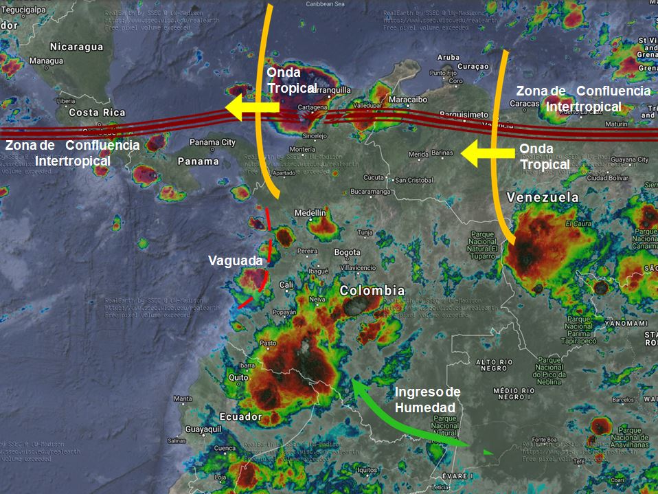 El paso de Ondas Tropicales del Este y su interacción con la Zona de Confluencia Intertropical y una Vaguada, generan un incremento en la nubosidad y lluvias en las regiones Pacifica, Caribe y en la Orinoquia.