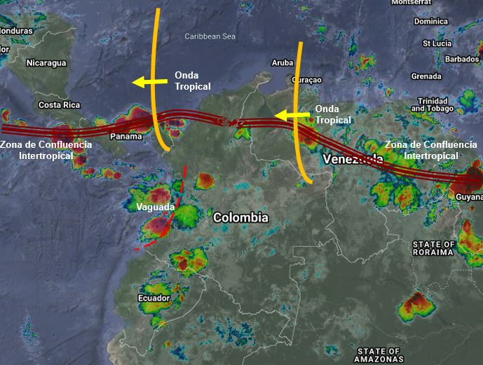 El ramal pacifico de la Zona de Confluencia Intertropical en interacción con una vaguada y el paso continuo de Ondas Tropicales del Este, generan nubosidad convectiva, lluvias de variada intensidad y tormentas en sectores de los departamentos de Cesar, Magdalena, Bolívar, Sucre, Córdoba, Antioquia, Los Santanderes, Boyacá, Cundinamarca, Tolima, Eje Cafetero, Chocó, Valle del Cauca, Cauca, Meta, Casanare, Arauca y Vichada. Precipitaciones ocasionales y lluvias de menor intensidad en Caquetá, Putumayo, Guaviare, Amazonas, Guainía y Vaupés.