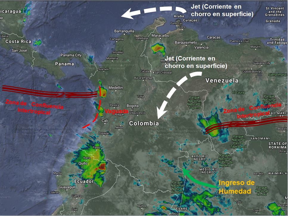 El ingreso de humedad desde el oriente y suroriente, genera un incremento en la nubosidad y lluvias en parte de las regiones Amazónica y Orinoquia en horas de la tarde y primeras horas de la noche. Corrientes de viento en Superficie (LLJ), generan vientos fuertes en la región Caribe con intensidades de 25 a 35 nudos y también en la Orinoquia con intensidades de 15 a 20 nudos, especialmente en Arauca y Casanare.