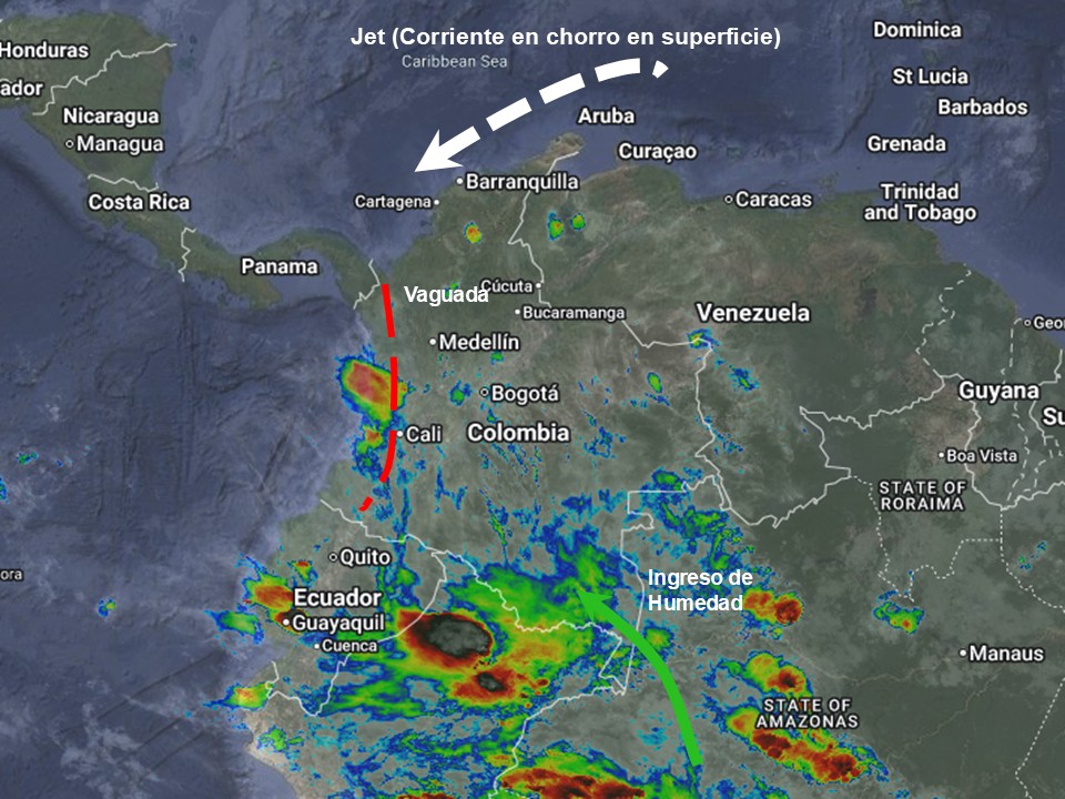 El ramal Pacífico de la Zona de Confluencia Intertropical, en interacción con dos vaguadas, el ingreso de humedad desde el suroriente del país y procesos convectivos locales favorecen condiciones inestables, que generan lluvias ligeras a moderadas y algunas tormentas en sectores de los departamentos de La Guajira, Magdalena, Atlántico, Antioquia, Chocó, Valle del Cauca, Cauca, Nariño, Eje Cafetero, Huila, Tolima, Cundinamarca, Boyacá, Los Santanderes, Putumayo, Caquetá, Guaviare, Guainía, Vaupés y Amazonas. Precipitaciones ocasionales y lluvias de menor intensidad en los departamentos de Bolívar, Sucre, Córdoba, Arauca, Casanare y Vichada.
