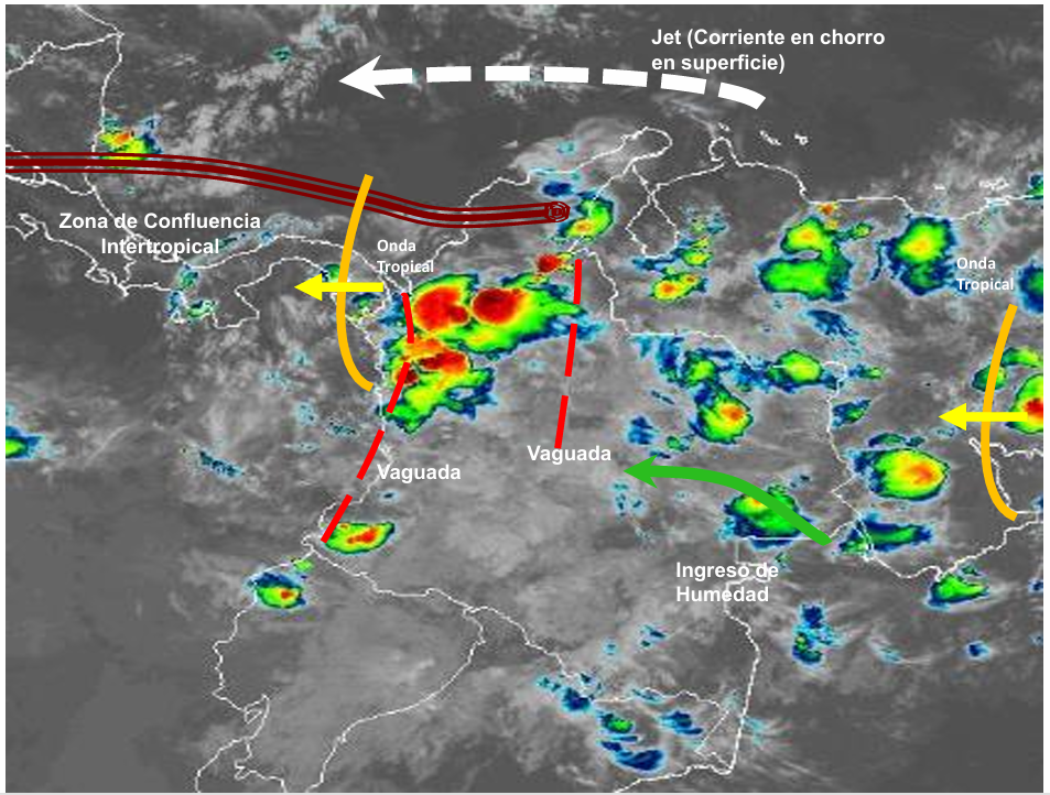 El ramal Pacífico de la Zona de Confluencia Intertropical en interacción con una Vaguada, el ingreso de humedad por el Oriente del país, así como procesos convectivos locales favorecen condiciones inestables, que generan lluvias ligeras a moderadas y algunas tormentas en sectores de los departamentos de Córdoba, Santanderes, Boyacá, Antioquia, Chocó, Eje Cafetero, Valle del Cauca, Cauca, Nariño, Putumayo, Caquetá, Guaviare, Amazonas, Meta, Arauca, Casanare, Vichada, Guainía y Vaupés. Precipitaciones ocasionales y lluvias de menor intensidad en los departamentos de Cesar, Magdalena, Bolívar, Sucre, Cundinamarca, Eje Cafetero, Tolima y Huila.