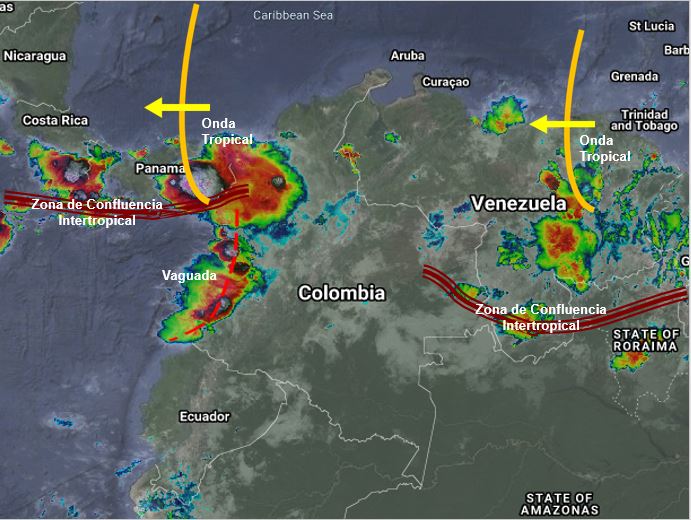 La interacción de la Zona de Confluencia Intertropical con una Vaguada en el pacífico, así como el ingreso de humedad por el oriente del país generan inestabilidad atmosférica produciendo lluvias fuertes en sectores de los departamentos de Chocó, Valle del Cauca, Cauca, Nariño y Vichada. Lluvias ligeras a moderadas en Magdalena, Cesar, Antioquia, Santanderes, Boyacá, Cundinamarca, Eje Cafetero, Arauca, Casanare, Meta, Guainía, Guaviare, Vaupés, Caquetá, Putumayo y Amazonas. Precipitaciones ocasionales en Córdoba, Bolívar, Guajira, Huila y Tolima.