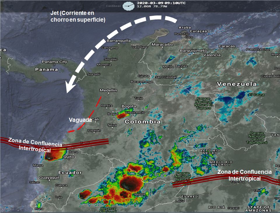 El ingreso de humedad desde el suroriente del país y la zona de confluencia intertropical ramal atlántico ubicada sobre el Amazonas, genera lluvias moderadas a fuertes y algunas tormentas en sectores de los departamentos de Caquetá, Meta, Vaupés, Guainía y Guaviare especialmente en horas de la tarde. Una Vaguada en interacción con la Zona de Confluencia Intertropical (ITCZ) en el Pacifico, favorece algunas precipitaciones ocasionales y lluvias sectorizadas en Nariño, Cauca, Valle del Cauca, Huila, Tolima, Chocó, Antioquia, Eje Cafetero, Cundinamarca, Boyacá y Santander. Corrientes en Chorro en Superficie (LLJ), favorece condiciones de tiempo seco y fuertes vientos entre 25 y 30 nudos (50 y 60 Km/h) en la región Caribe.