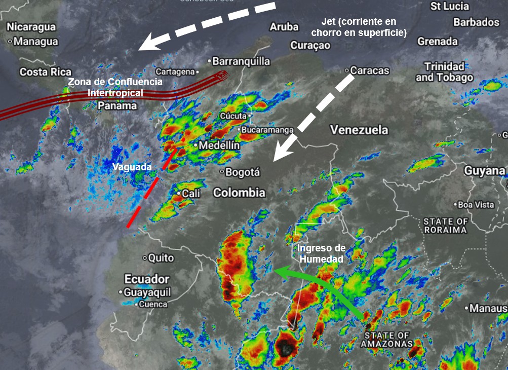 El ramal Pacífico de la Zona de Confluencia Intertropical en interacción con una Vaguada, el ingreso de humedad por el Suroriente del país, así como procesos convectivos locales, favorecen condiciones inestables que generan lluvias sectorizadas a fuertes y algunas tormentas en sectores de los departamentos de Antioquia, Boyacá, Caldas, Caquetá, Casanare, Cauca, Cesar, Chocó, Córdoba, Cundinamarca, Guainía, Guaviare, Huila, Magdalena, Meta, Nariño, Norte de Santander, Putumayo, Quindío, Risaralda, Santander, Tolima, Valle del Cauca, Vaupés y Vichada. Precipitaciones ocasionales y lluvias de menor intensidad en los departamentos de Atlántico, Guajira, Sucre, Bolivar y Arauca
