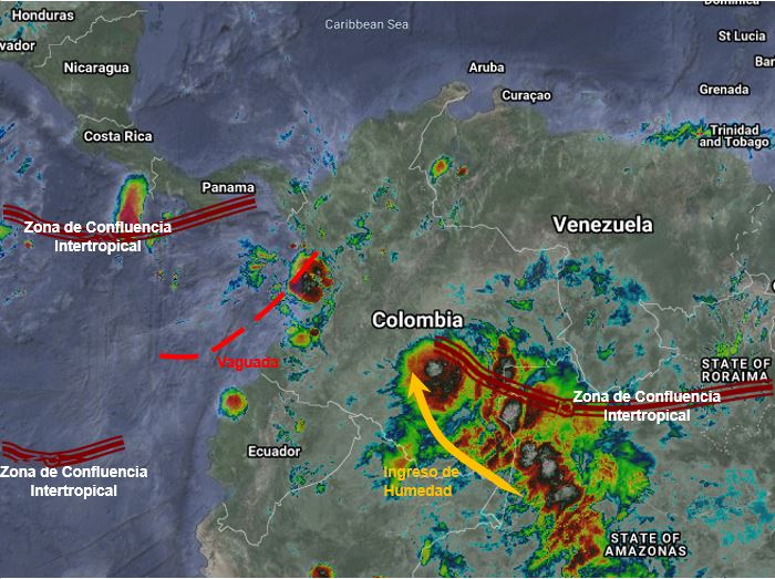 La interacción de la Zona de Confluencia Intertropical (ITCZ) con una Vaguada en el Pacifico y el ingreso de humedad desde el oriente y sur del país, generan lluvias de variada intensidad y algunas tormentas en sectores de los departamentos de Nariño, Cauca, Valle del Cauca, Chocó, Huila, Tolima, Antioquia, Eje Cafetero, Cundinamarca, Boyacá, Santander, Córdoba, Bolívar, Casanare, Meta, Putumayo, Caquetá, Amazonas, Guainía, Guaviare, Vaupés y Vichada.