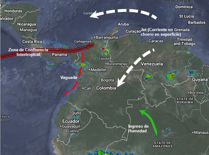 El ramal Pacífico de la Zona de Confluencia Intertropical en interacción con una Vaguada, un Sistema de Baja Presión, así como procesos convectivos locales favorecen condiciones inestables que generan lluvias ligeras a moderadas en sectores de los departamentos de Magdalena, Atlántico, Bolívar, Antioquia, Santanderes, Chocó, Valle del Cauca, Cauca, Nariño, Putumayo, Cundinamarca, Eje Cafetero, Vichada, Guainía, Vaupés y Amazonas. Precipitaciones ocasionales y lluvias de menor intensidad en los departamentos de Cesar, Córdoba, Boyacá, Arauca, Casanare, Huila, Tolima y Guaviare.