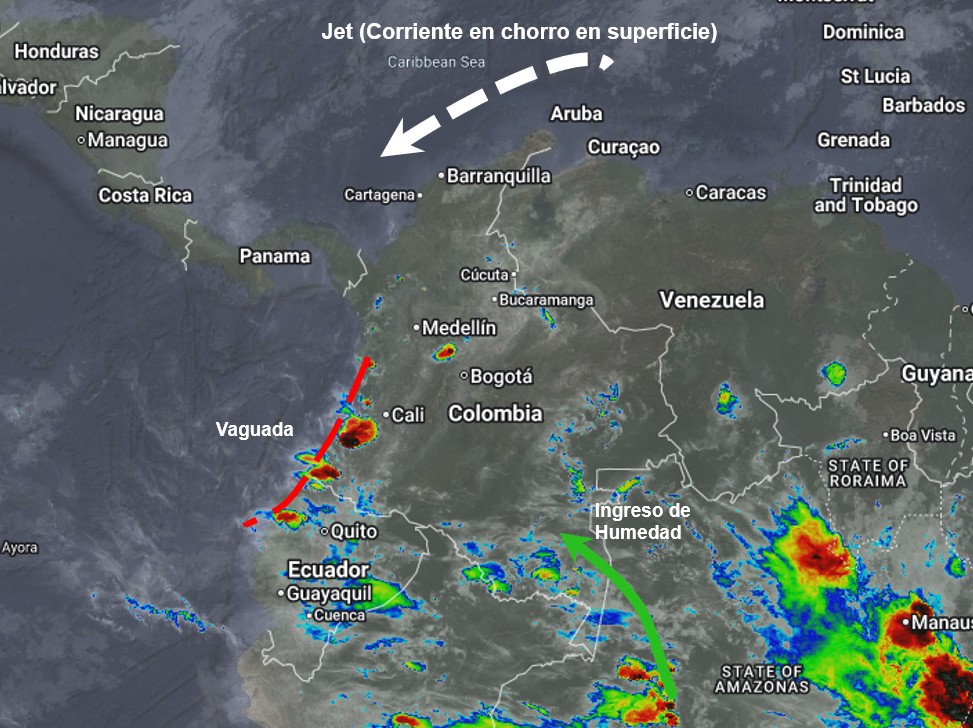 El ramal Pacífico de la Zona de Confluencia Intertropical, en interacción con dos vaguadas, el ingreso de humedad desde el suroriente del país y procesos convectivos locales favorecen condiciones inestables, que generan lluvias ligeras a moderadas y algunas tormentas en sectores de los departamentos de Choco, Valle del Cauca, Cauca, Nariño, Antioquia, Eje Cafetero, Vaupés y Amazonas. Precipitaciones ocasionales y lluvias de menor intensidad en los departamentos de Arauca, Atlántico, Bolívar, Boyacá, Caquetá, Casanare, Cesar, Córdoba, Cundinamarca, Guainía, Guaviare, Huila, La Guajira, Magdalena, Meta, Norte de Santander, Putumayo, Santander, Sucre, Tolima y Vichada.