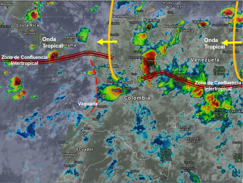 La interacción del ramal Pacifico de la Zona de Confluencia Intertropical con una Vaguada y el paso de una Onda Tropical del Este, generan condiciones inestables en gran parte del territorio nacional, ocasionando lluvias moderadas a fuertes y algunas tormentas en sectores de los departamentos de Cesar, Magdalena, Atlántico, Bolívar, Sucre, Córdoba, Norte de Santander, Santander, Boyacá, Cundinamarca, Chocó, Valle del Cauca, Cauca, y Nariño; Precipitaciones ocasionales y lluvias de menor intensidad en Amazonas, Vaupés, Guaviare, Guainía, Vichada, Meta, Arauca, Casanare. Antioquia, Eje Cafetero, Tolima, Huila, Caquetá y Putumayo.