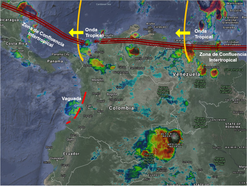 El paso continuo de Ondas Tropicales genera condiciones inestables en gran parte del territorio nacional. Las lluvias más fuertes se prevén en las regiones Andina y Pacífica, especialmente en sectores de Cauca, Valle del Cauca, Eje Cafetero, Antioquia, Tolima, Cundinamarca, Boyacá, Los Santanderes y el sur de los departamentos de Magdalena y Bolívar. Lluvias de menor intensidad Putumayo, Caquetá, Huila, Amazonas, Vaupés, Guaviare, Guainía, Vichada, Arauca, Casanare, Meta, Córdoba, Sucre y el centro y norte de los departamentos de Bolívar, Atlántico, Magdalena, Cesar y La Guajira.