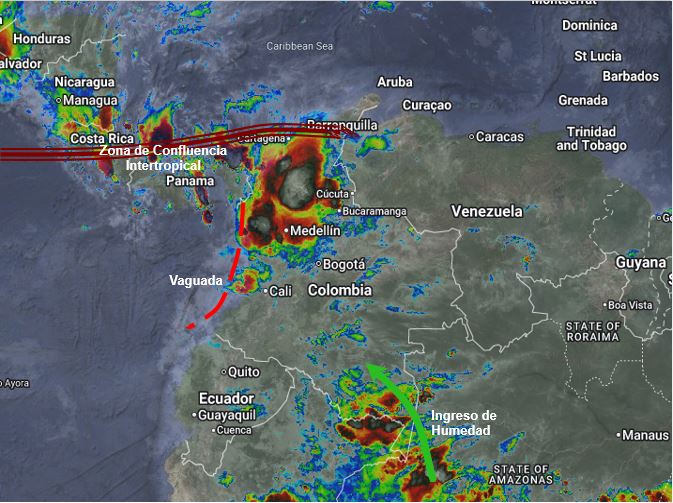 El ramal Pacífico de la Zona de Confluencia Intertropical en interacción con una Vaguada, un Sistema de Baja Presión, así como procesos convectivos locales favorecen condiciones inestables, que generan lluvias ligeras a moderadas y algunas tormentas en sectores de los departamentos de Cesar, Magdalena, Atlántico, Bolívar, Sucre, Córdoba, Antioquia, Santanderes, Boyacá, Cundinamarca, Eje Cafetero, Chocó, Valle del Cauca, Cauca, Putumayo, Caquetá, Amazonas, Vaupés, Guaviare y Vichada. Precipitaciones ocasionales y lluvias de menor intensidad en los departamentos de Guajira, Arauca, Casanare, Meta, Guainía, Tolima, Huila y Nariño.
