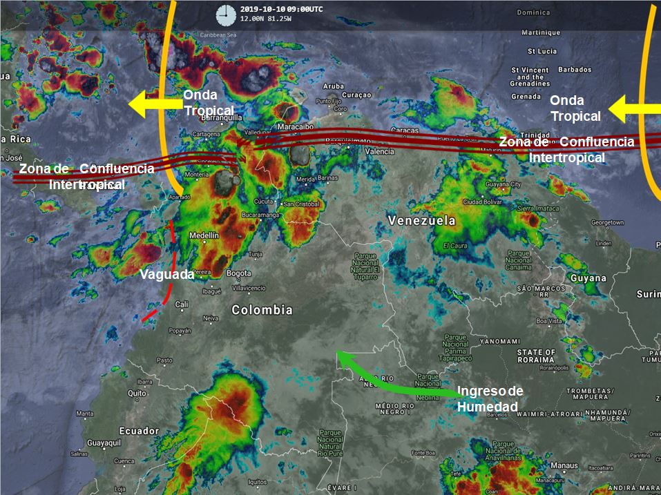 La interacción de la zona de confluencia intertropical con una vaguada, el paso de una onda tropical y el ingreso de humedad desde el oriente, favorecen el incremento de nubosidad y lluvias de variada intensidad, algunas acompañadas de actividad eléctrica, en varios sectores del país.