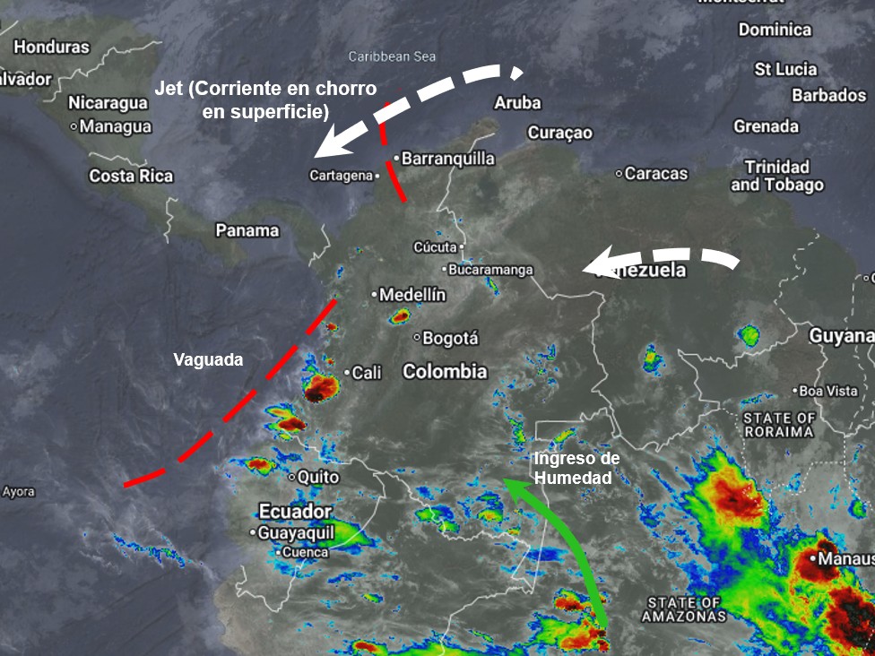 El ramal Pacífico de la Zona de Confluencia Intertropical, en interacción con dos vaguadas, un Sistema de Baja Presión, ingreso de humedad desde el suroriente del país y procesos convectivos locales favorecen condiciones inestables, que generan lluvias ligeras a moderadas y algunas tormentas en sectores de los departamentos de Chocó, Valle del Cauca, Cauca, Nariño, Antioquia, Eje Cafetero, Santander, Guainía, Vaupés y Amazonas. Precipitaciones ocasionales y lluvias de menor intensidad en los departamentos de Arauca, Atlántico, Bolívar, Boyacá, Caquetá, Casanare, Cesar, Córdoba, Cundinamarca, Guaviare, Huila, La Guajira, Magdalena, Meta, Norte de Santander, Putumayo, Sucre, Tolima y Vichada.