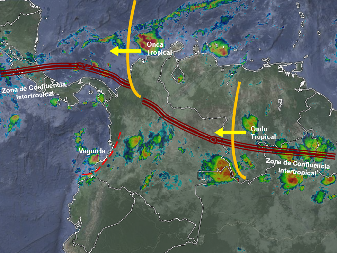 La interacción de la Zona de Confluencia Intertropical y Onda Tropical del Este generan inestabilidad atmosférica en gran parte del territorio nacional. Lluvias moderadas a fuertes y tormentas en Nariño, Cauca, Valle del Cauca, Eje Cafetero, Chocó, Antioquia, Boyacá y Los Santanderes. Precipitaciones de menor intensidad en Cesar, La Guajira, Magdalena, Atlántico, Bolívar, Sucre, Córdoba, Putumayo, Caquetá, Huila, Tolima, Cundinamarca, Arauca, Casanare, Meta, Vichada, Guaviare, Vaupés y Amazonas.