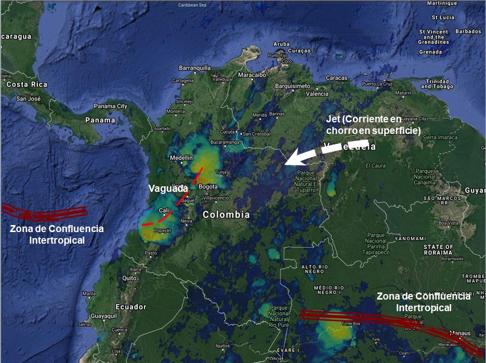 Una Vaguada en niveles bajos genera inestabilidad en gran parte de las regiones Andina y Pacifica, especialmente en horas de la tarde y noche con lluvias de variada intensidad y tormentas en sectores Nariño, Cauca, Valle del Cauca, Chocó, Antioquia, Risaralda, Caldas, Quindío, Tolima, Cundinamarca, Boyacá y Santander. El ramal atlántico de la zona de confluencia intertropical genera lluvias moderadas a fuertes y algunas tormentas en sectores de los departamentos de Amazonas, Caquetá, Vaupés, Guainía, Guaviare y Putumayo.