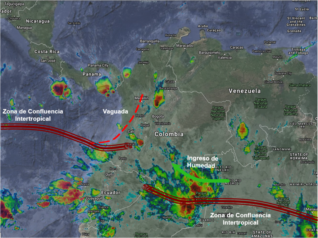 El ramal pacifico de la Zona de Confluencia Intertropical (ZCIT) en interacción con una Vaguada en niveles bajos, continua generando condiciones inestables en el centro, occidente y suroccidente del país, lluvias de variada intensidad, algunas acompañadas de actividad eléctrica, especialmente en horas de la tarde y noche en sectores de los departamentos de Putumayo, Nariño, Cauca, Valle del Cauca, Chocó, Antioquia, Eje Cafetero, Tolima, Huila, Santander, Boyacá, Cundinamarca, Córdoba, Sucre y el sur de Bolívar. El ingreso de humedad por el suroriente del territorio nacional favorece lluvias ligeras a moderadas y algunas tormentas aisladas en Amazonas, Caquetá, Vaupés y Guainía. Se mantiene activa corriente en chorro en superficie en el mar Caribe con vientos entre 20 y 30 nudos (36 a 54 km/h), favoreciendo condiciones de tiempo seco en el norte del país.