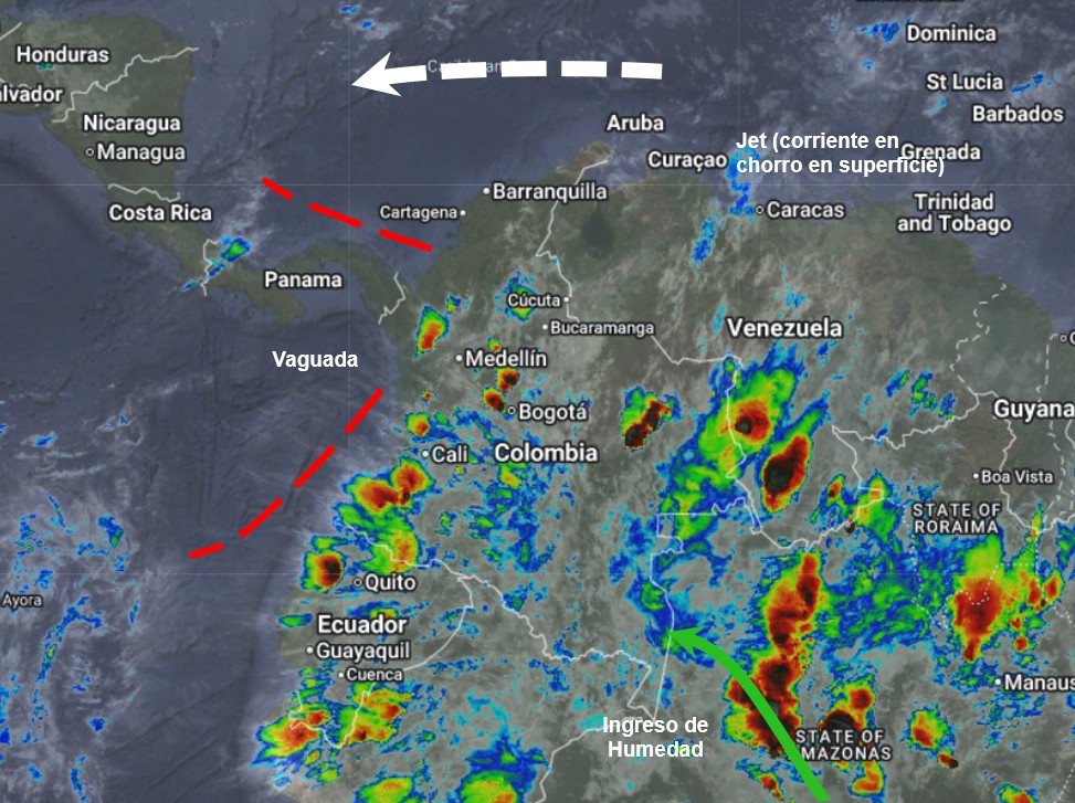 El ramal Pacífico de la Zona de Confluencia Intertropical, en interacción con una Vaguada, un Sistema de Baja Presión, el ingreso de humedad desde el suroriente del país y procesos convectivos locales favorecen condiciones inestables, que generan lluvias ligeras a moderadas y algunas tormentas en sectores de los departamentos de Amazonas, Antioquia, Bolívar, Boyacá, Caldas, Caquetá, Cauca, Chocó, Córdoba, Cundinamarca, Guainía, Huila, Nariño, Putumayo, Quindío, Risaralda, Santander, Tolima, Valle del Cauca, Vaupés y Vichada. Precipitaciones ocasionales y lluvias de menor intensidad en los departamentos de Arauca, Guaviare, Casanare, Meta, Atlántico, Cesar, Magdalena, Sucre, la Guajira y Norte de Santander.