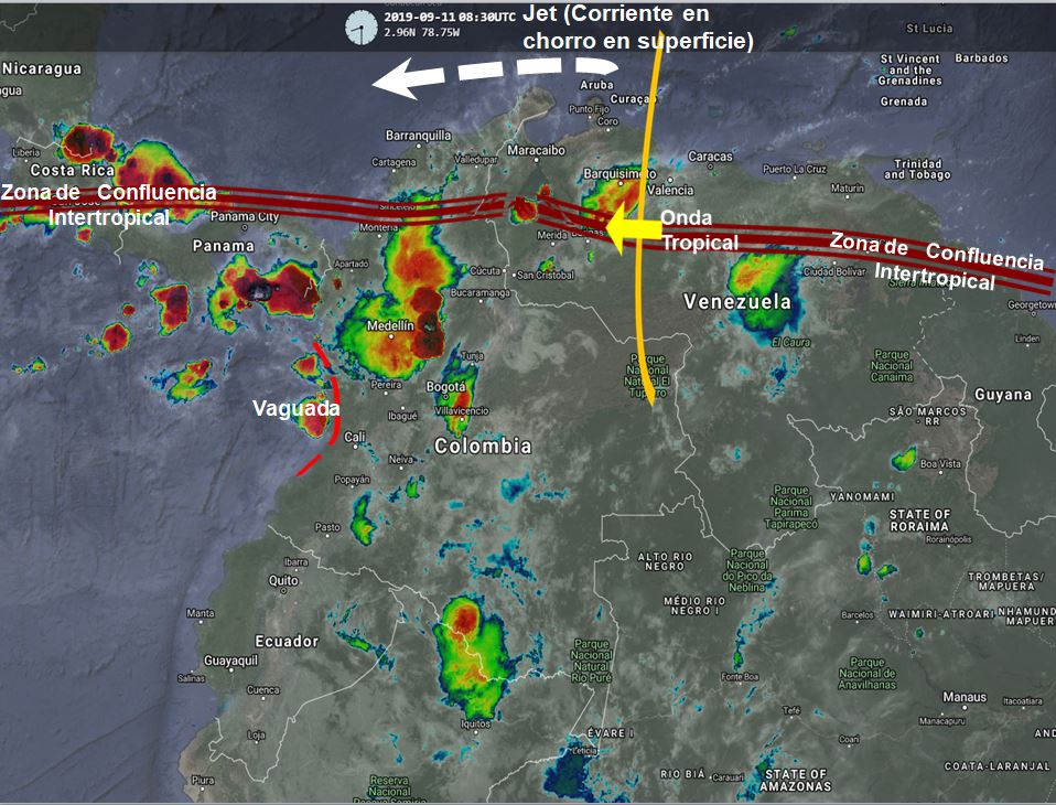 El paso de una Onda Tropical del Este en la interacción con la Zona de Confluencia Intertropical, una Vaguada y un sistema de baja presión, generan inestabilidad atmosférica en las regiones Andina, Caribe, Orinoquia y Pacifica, especialmente en horas de la tarde y noche. Una Corriente en Chorro en Superficie continúa generando vientos fuertes en la zona marítima del norte de Colombia con intensidades de entre 20 y 25 nudos (40 a 50 Km/h).
