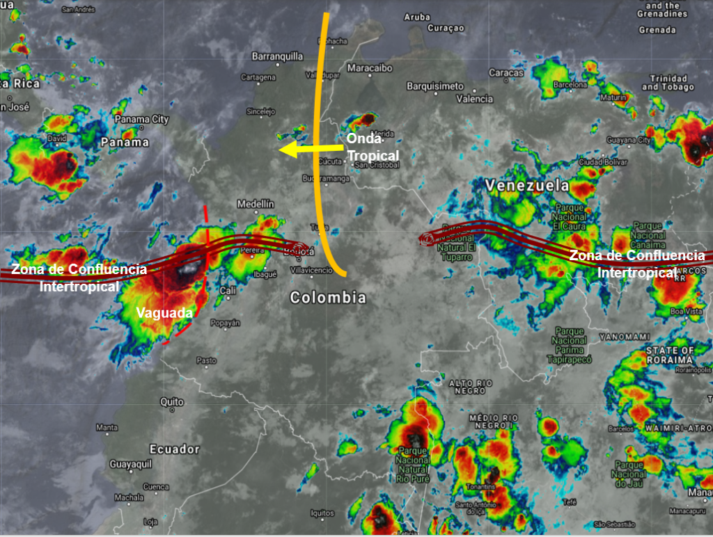 El ramal pacifico de la Zona de Confluencia Intertropical en interacción con una vaguada y el paso de Ondas Tropicales del Este, generan nubosidad convectiva produciendo lluvias de variada intensidad y tormentas en sectores de los departamentos de Guajira, Cesar, Magdalena, Atlántico, Bolívar, Córdoba, Antioquia, Chocó, Valle del Cauca, Santander y Boyacá. Precipitaciones ocasionales y lluvias de menor intensidad en Cauca, Nariño, Cundinamarca, Putumayo, Caquetá, Meta, Guaviare, Vichada, Casanare y Arauca.